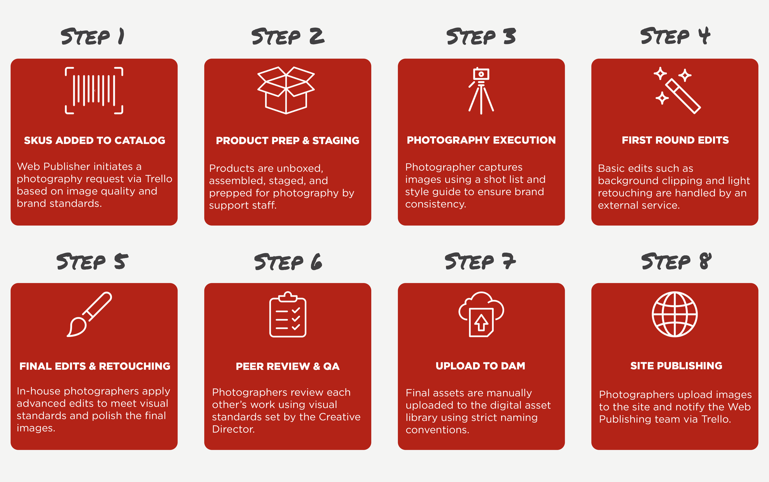 I conducted a full audit of the photography workflow and implemented a ground-up overhaul across people, process, and tools.